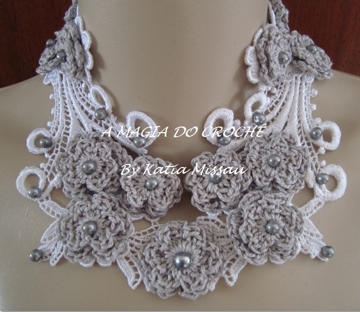 Olá amigas! Hoje vim mostrar o colar Angel com base branca em guipir e flores cinza claro. Os detalhes ficaram por conta das perolas cinza chumbo.