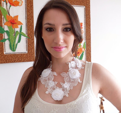 Olá amigas! Esse colar foi sucesso no meu blog e agora ele volta com a mesma delicadeza e charme. Composto por uma linda base de renda guipir, rosas e flores delicadas feitas em crochê com a linha Cléa. Contas perolizadas deram acabamento à peça. Pode ser usado em ocasiões especiais e também com um look mais despojado, pois as rendas estão super em alta nesta temporada.