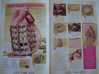 Olá amigas! Com muita alegria vim mostrar meu primeiro trabalho feito com lacres. É um porta- níquel em formato de mini mochila...ficou lindinho e muito prático. Esse eu fiz pra mim...já estou confeccionando em outras cores. Parece pequeno mas cabe bastante moedas!! Usei linha Liza grossa e agulha 1,75 mm. Também foram usados 36 lacres. Adorei o resultado...Logo vou mostrar outros trabalhos feitos com lacres!! Bjoooossss