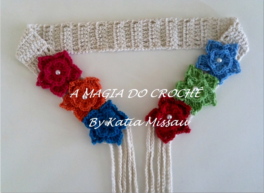 Olá amigas! Para dar inicio a essa semana de natal, deixo uma sugestão fácil de ser feita, e pode servir como um belo presente. Um cinto feito com a base em pontos alto e flores aplicadas nas pontas. Tiras de correntinhas deram acabamento a peça.